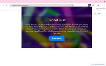 Tunnel Rush is a fast-paced arcade game available as a Chrome add-on that challenges players to navigate a twisting tunnel filled with obstacles. With simple arrow key controls, it offers an accessible yet exhilarating experience for users of all skill levels. The vibrant graphics enhance the immersive gameplay, making it visually appealing and engaging.